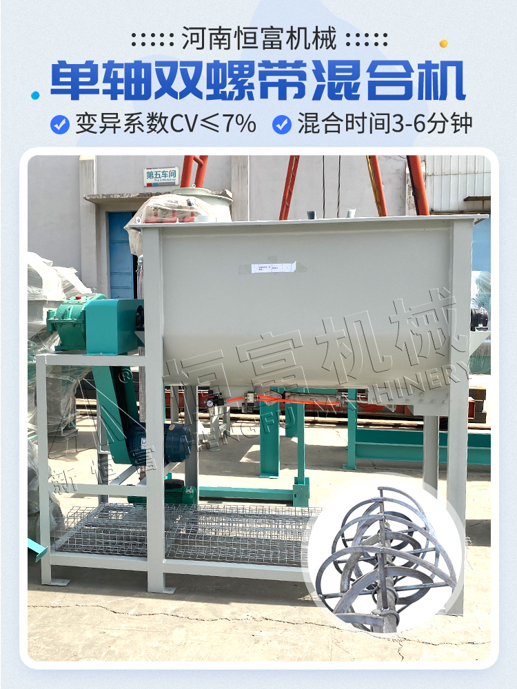 單軸雙螺旋(xuán)混合機混合物料時具有高速,高效的特(tè)點,物料在(zài)螺旋攪拌軸(zhóu)的帶動下,使(shǐ)得物料(liào)快速的翻滾(gǔn)。