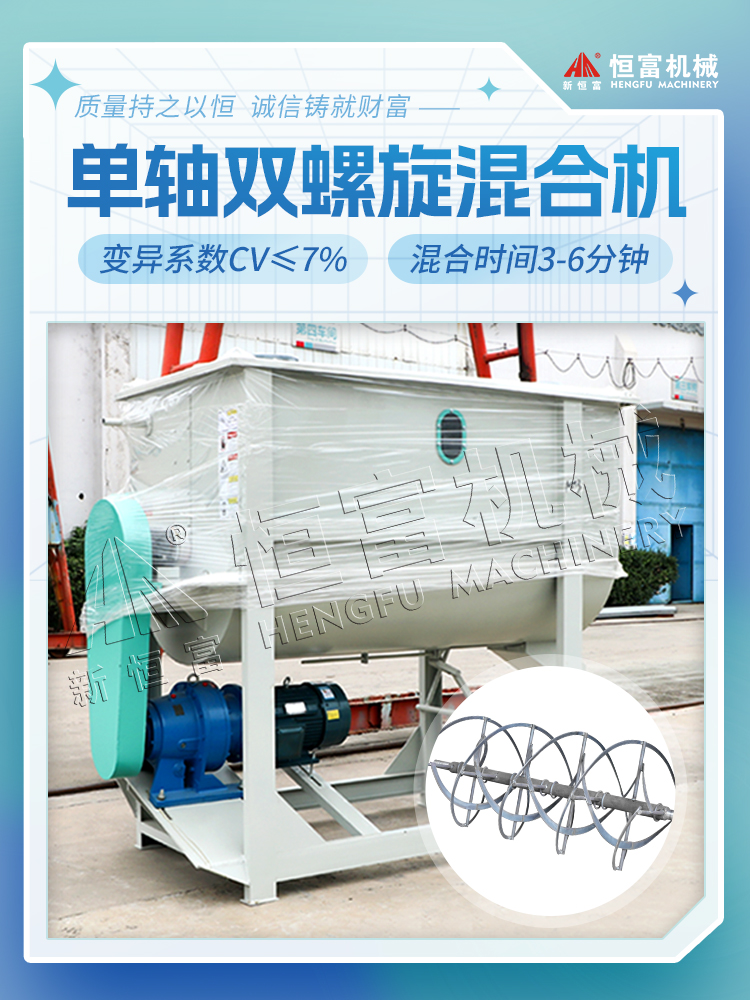 該混合機采用內外雙層螺帶交錯(cuò)往返式進行攪拌混合物(wù)料,具有混合速度快、混(hún)合均勻(yún)度變異係數CV≤7%、可配套液體添加係統、適用範圍廣泛等特點。