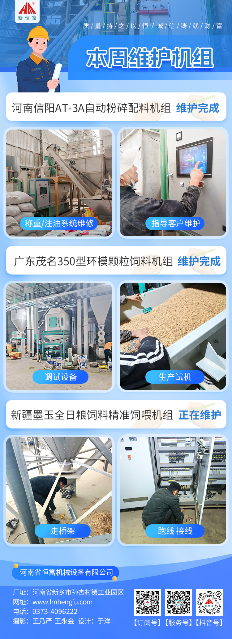 在上周,恒富機械有2套成(chéng)套設備安裝完成,2套成套設備正在安裝(zhuāng),2套成套設(shè)備維護完成,1套成套(tào)設備正在維護。