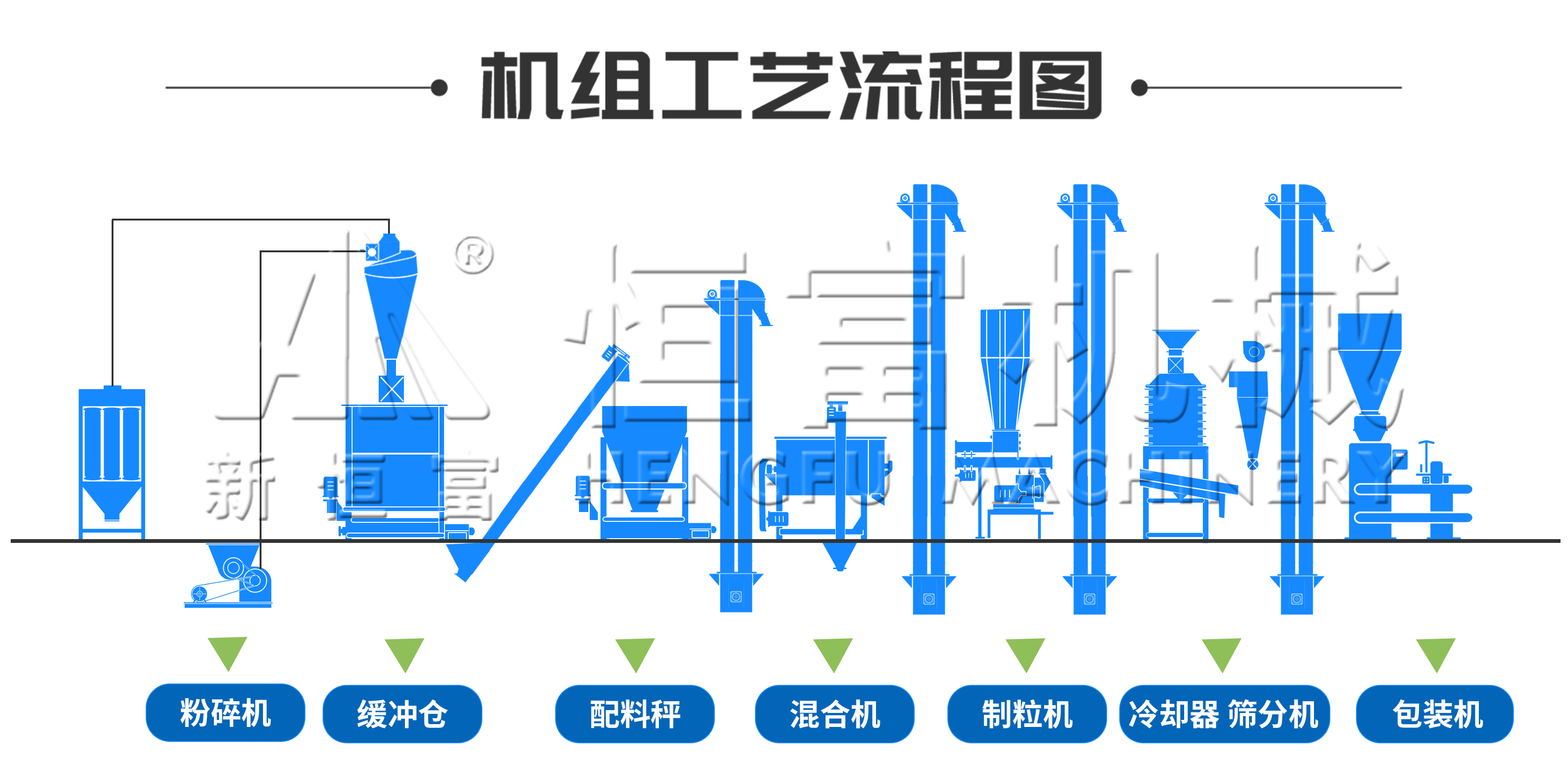 客戶加(jiā)工出來的成品飼料一部分對外出售,一部分儲(chǔ)存飼(sì)喂(wèi)。這是一套完成的顆粒飼料(liào)加工生產線,包含工段有:配料、粉碎、混合、製(zhì)粒、冷卻、篩分(fèn)、打包、存儲等(děng)。主機設備有:水滴式飼料粉碎機、臥式單軸雙螺(luó)帶飼料混合機(jī)、環模(mó)飼料顆粒機、逆流式飼料冷卻(què)器、自動定量飼料包裝機、成品飼料料塔等。