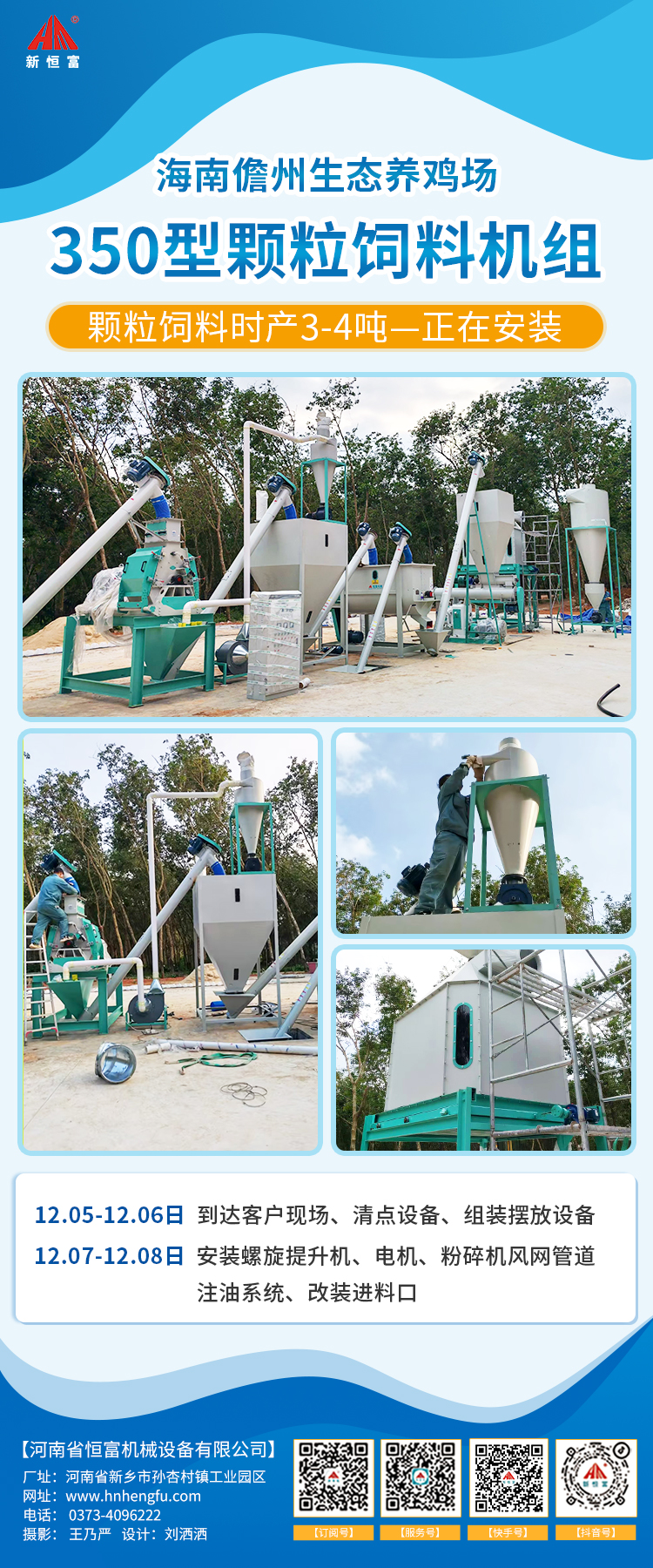 海南儋州生態養雞場,時產4噸顆粒(lì)飼料加工機(jī)組正在(zài)安裝。