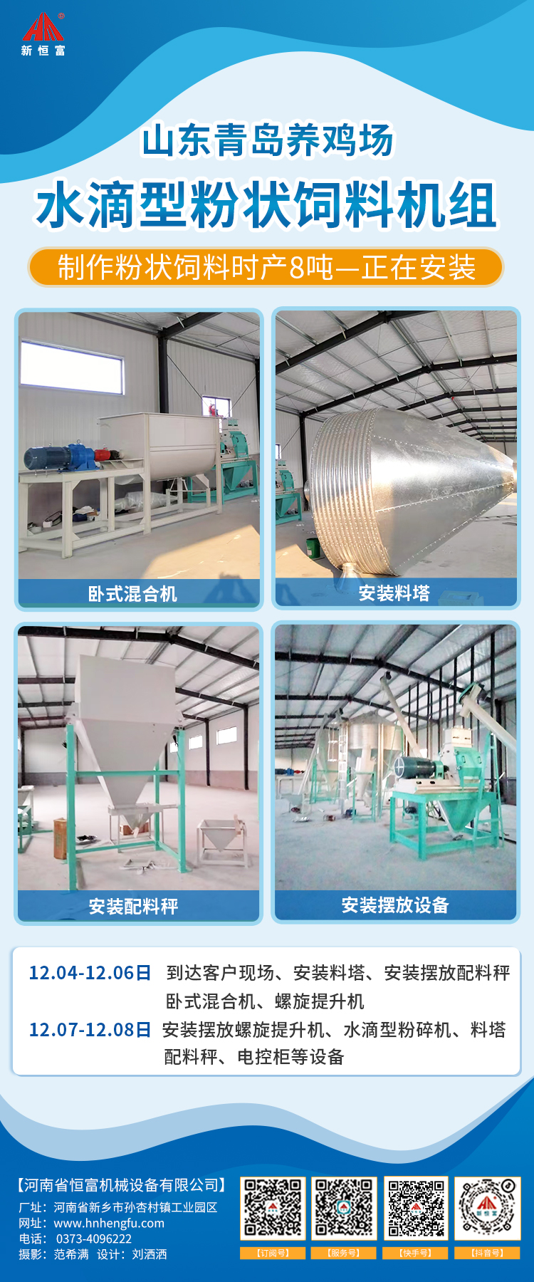 山東青島蛋雞養殖場,時產8噸粉狀飼料加工機組正在安裝。