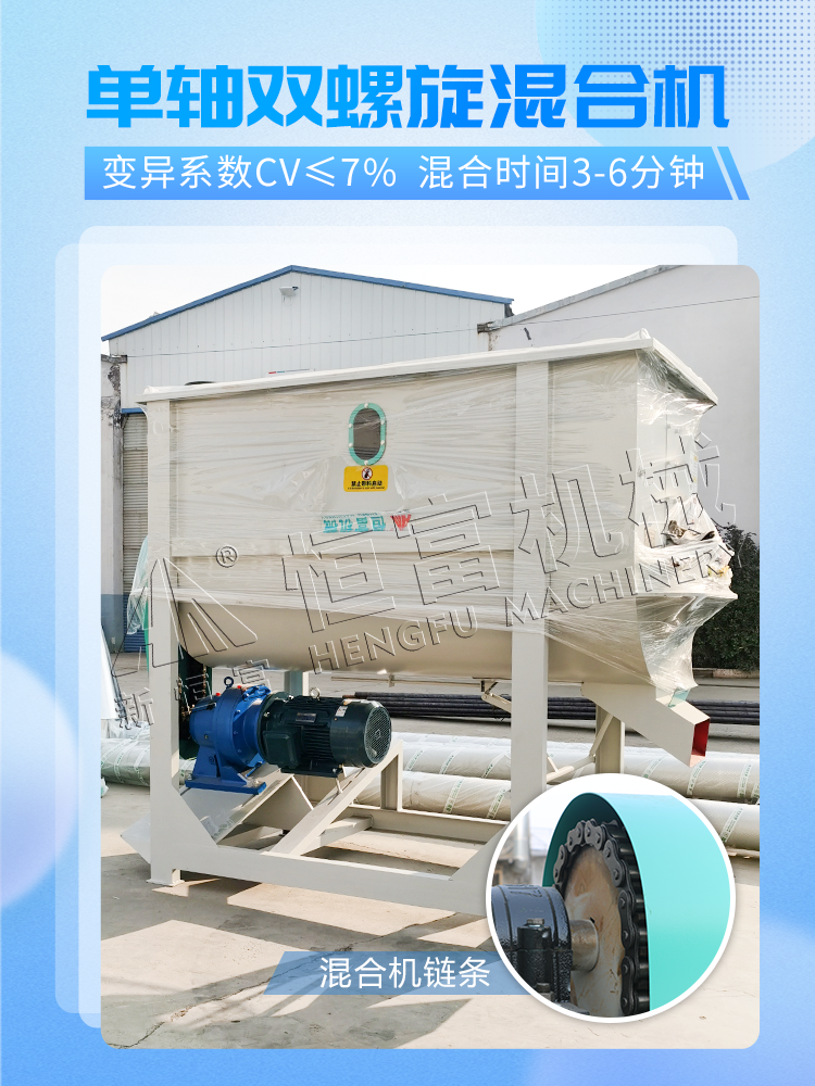 單軸雙螺旋混合機混合物料時具有高速,高效的特點(diǎn),其占地小,運行穩,速度快(kuài),均勻度高等優勢,已經成為飼料工廠的主要混(hún)合設備之一。