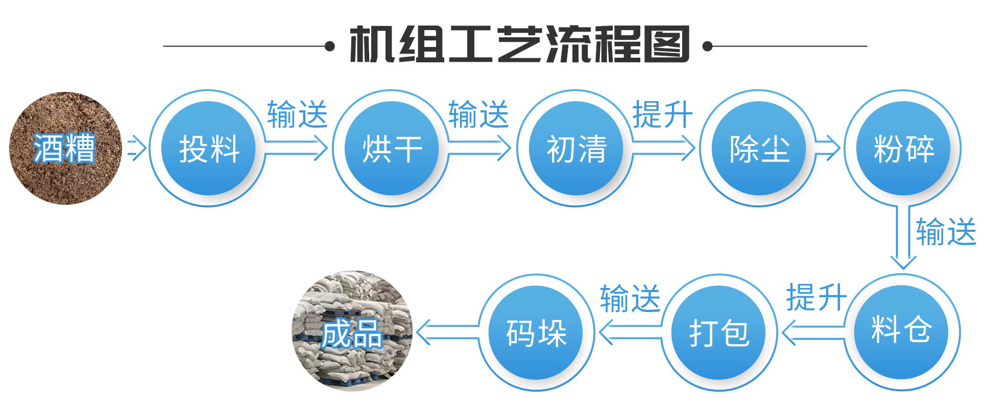 該生產線主要是以烘幹後的酒糟為原料來製作(zuò)牛的精補飼料。設(shè)備前端先對濕(shī)酒糟進行烘幹、初清處理,然後再進行粉碎(suì)、包裝、碼(mǎ)垛等。包含設備(bèi)有:烘幹機(客戶自有)、圓筒(tǒng)原料初清篩、2台水滴型飼料粉碎機、2台脈衝飼料除塵器、2個30m³鍍鋅料塔(tǎ)、2個2m³待粉碎倉、包裝碼垛(duǒ)設備、提升輸送(sòng)設(shè)備以及控製係統等。