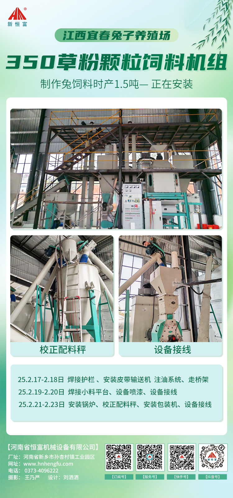 江(jiāng)西宜春兔子養殖場,時(shí)產1.5噸草粉(fěn)顆粒飼料加工機組正在安裝。
